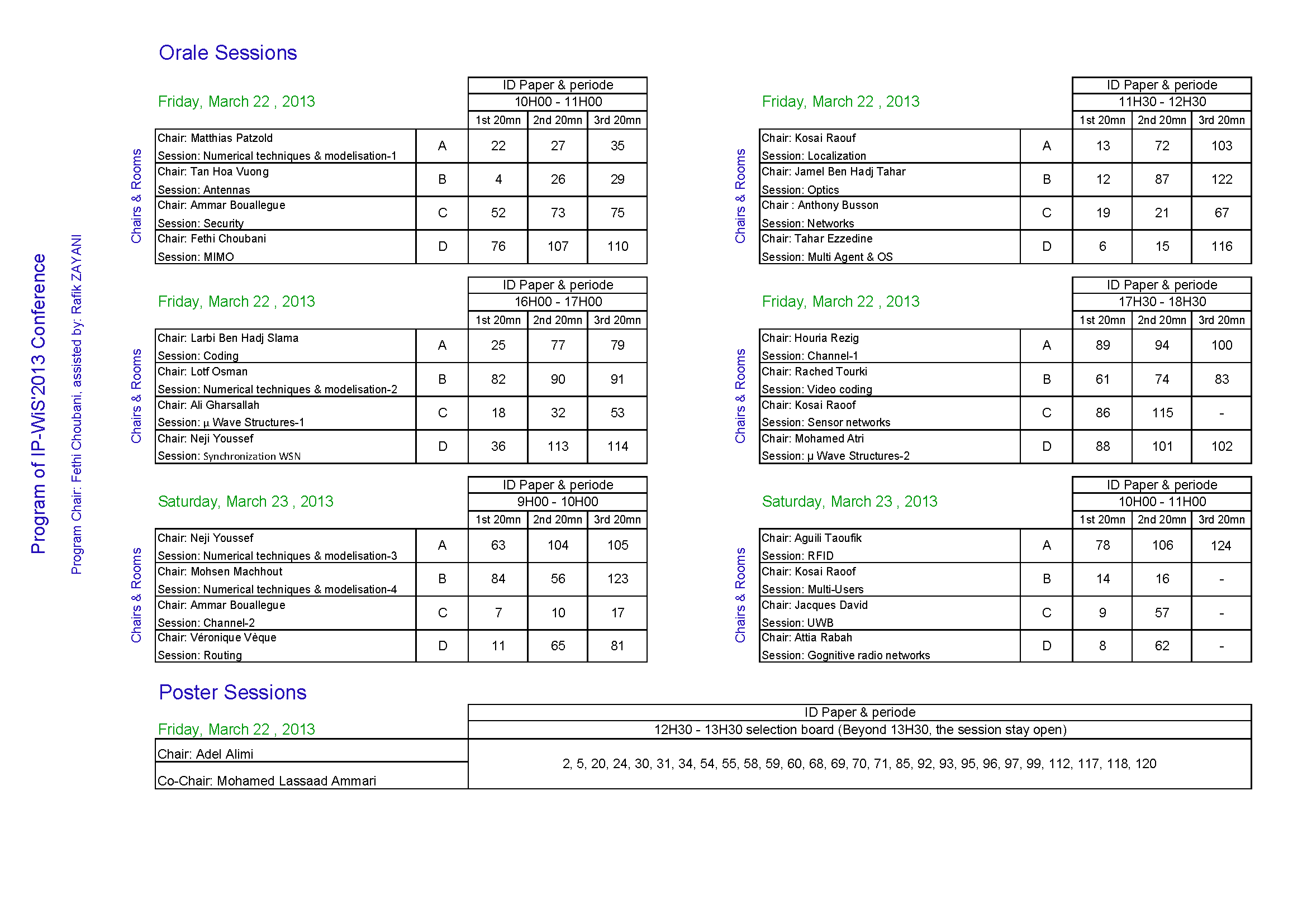 | 8:00 - 8:30 | Arrival & Registration (bus is scheduled [Tunis-Djerba] with multiple stops : major cities, see Web site of conference) | OPENING CEREMONY : Minister of Information Technologies and Communication & Plenary Session 1 | Plenary Session 3 | |
